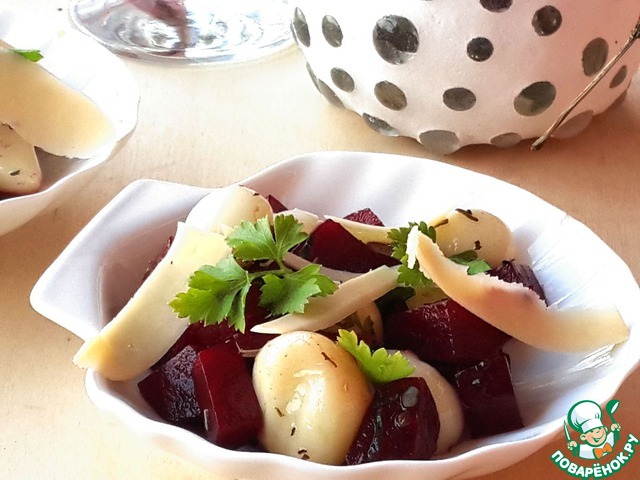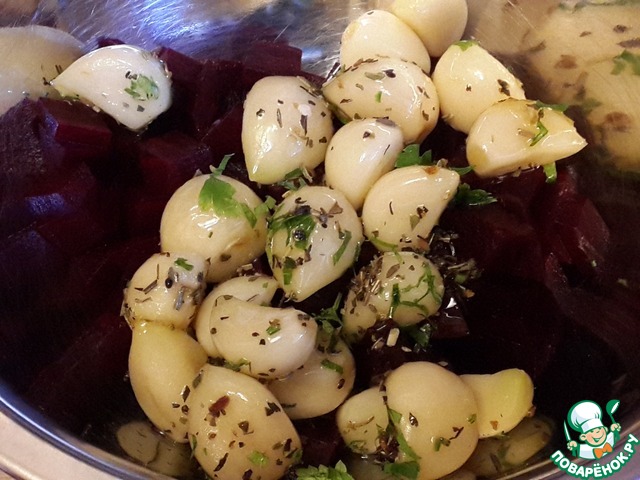 Остывшую свеклу нарезать кубиками, добавить к ней жареный чеснок, слегка посолить