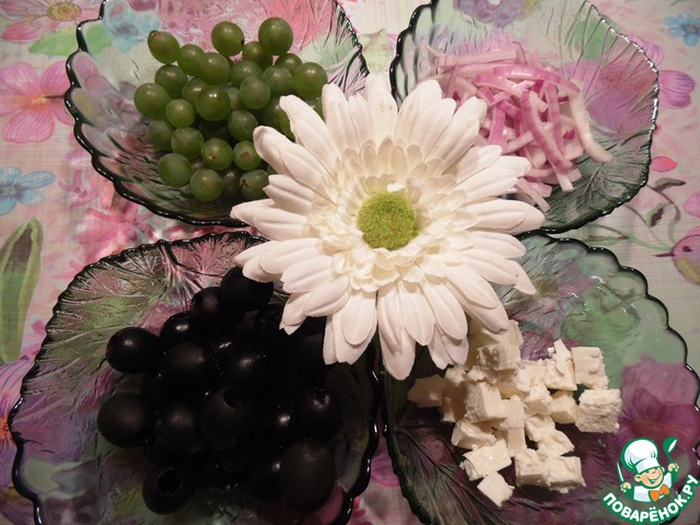 Из маслин слить жидкость, виноград помыть и обсушить, лук нарезать полукольцами, фетаки нарезать кубиками. Все ингредиенты для салата смешать, заправить соком лимона.