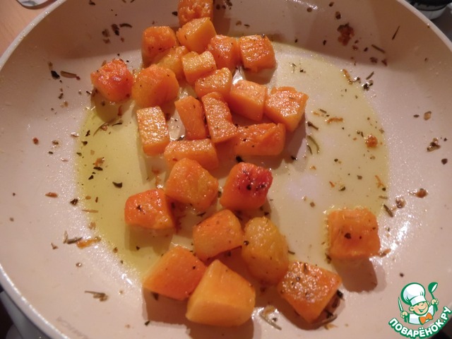 Тыкву нарезать небольшими кубиками, посолить, поперчить, приправить травами, тушить на небольшом огне, помешивая, 5-7 минут.