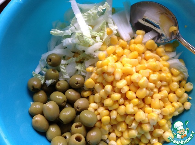 С кукурузы и оливок слить жидкость, капусту нашинковать