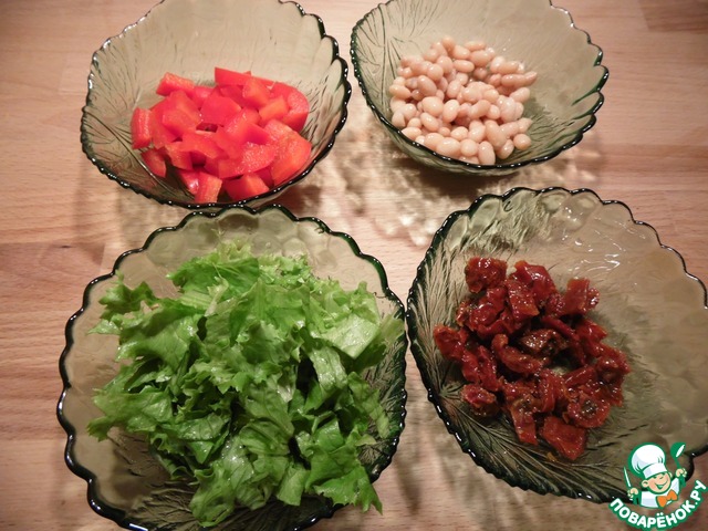 Салат нашинковать, перец нарезать небольшими кубиками, томаты измельчить, из фасоли слить жидкость.