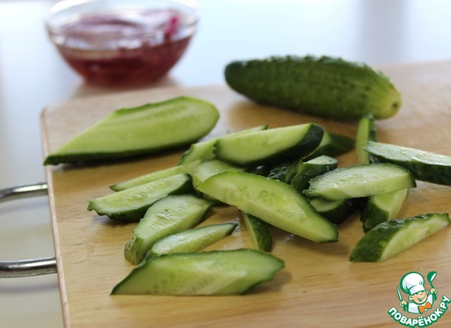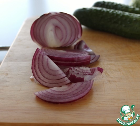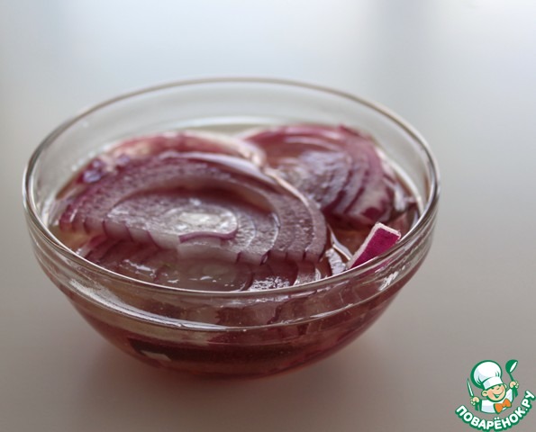 Замариновать нарезанный лук в смеси 4 ст. л винного уксуса, 4 ст. л растительного масла, 1/2 ч. л сахара, соли