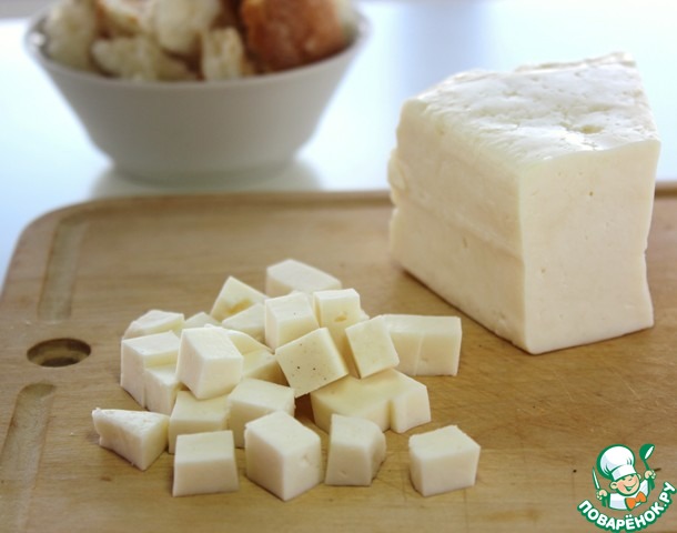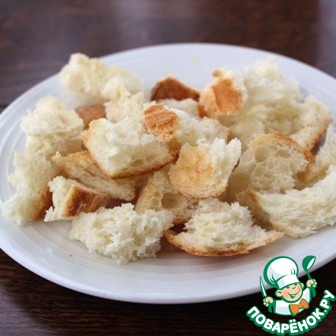 Пока маринуется лук, наломать чиабатту на кусочки, размером на один укус.