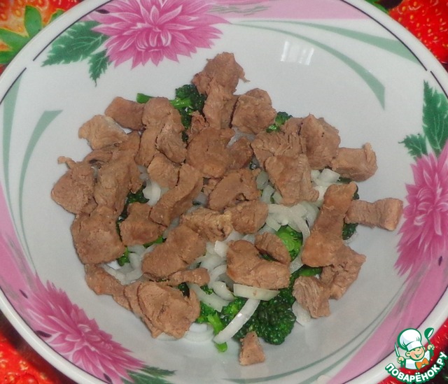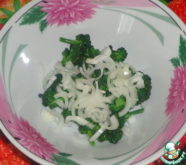 Репчатый лук очистить и порезать полукольцами. Лук залить горячей водой на 1 минуту, а затем прополоснуть холодной водой. Лук смешиваем с брокколи.