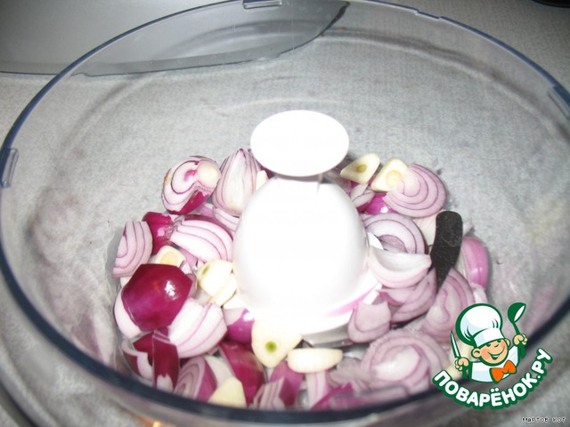 Лук и чеснок кладем в кухонный комбайн.
