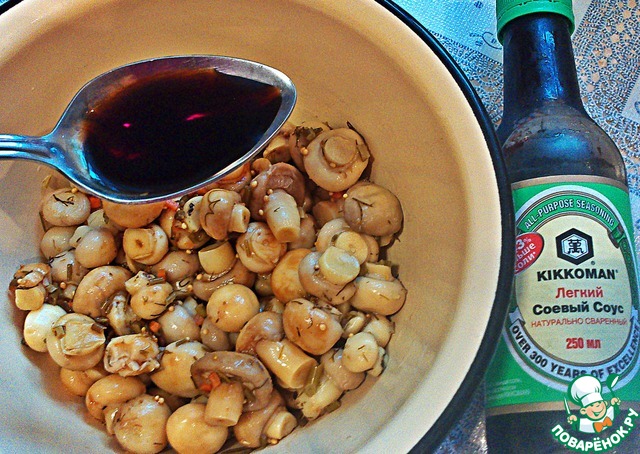 В тарелку с шампиньонами налить соевый соус Kikkoman, перемешать и оставить мариноваться на 30 минут. Затем шампиньоны порезать мелкими кубиками и разделить на две части.