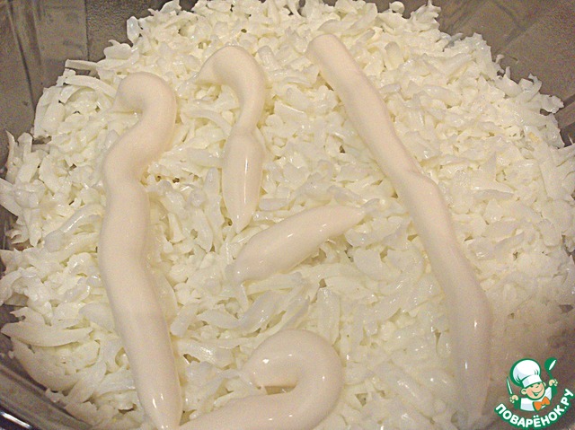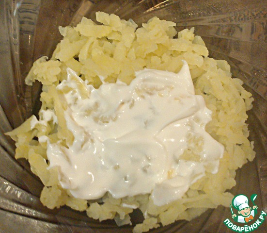 На дно салатницы натереть на крупной терке отварной картофель. Сверху тоненько смазать майонезом.