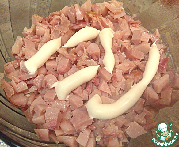 Копченый окорочок отделить от кости, мелко порезать, положить сверху на слой шампиньонов и обмазать майонезом.