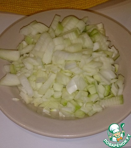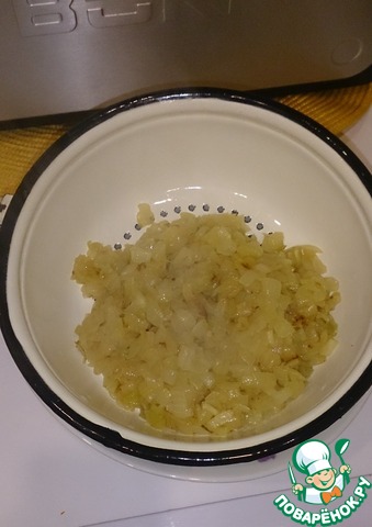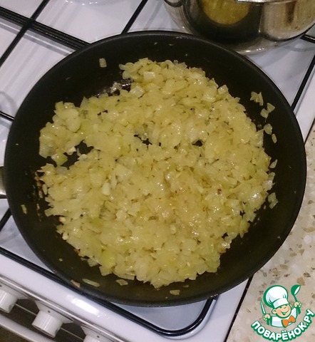 Далее обжариваем лук на разогретой сковороде с растительным маслом до готовности и золотистого цвета, лука должно стать в два раза меньше