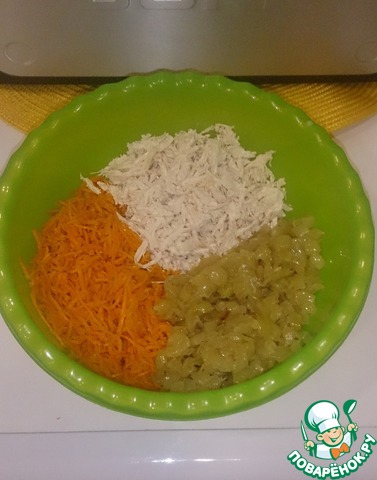 Когда все готово, в морковь добавляем наш лук, далее берем грудку и щиплем ее, чтобы получались волокна, главное не резать ее, тоже добавляем в салат, при перемешивании будет по началу сложно, но в итоге все перемешается)))