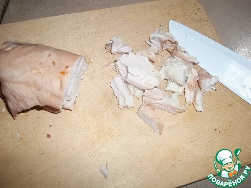 Отварную куриную грудку нарезать небольшими кусочками.
