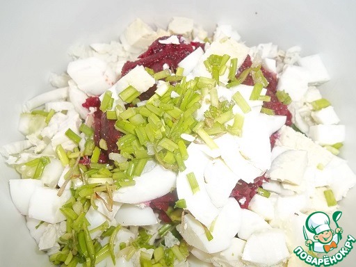 Нарезанные яйца и зеленый лук.