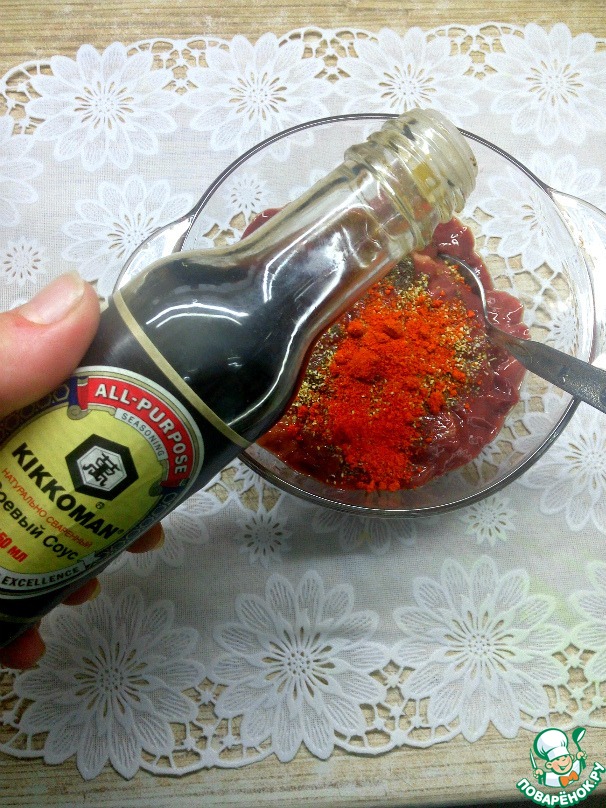 Печень промыть, промокнуть салфеткой, нарезать небольшими кусочками, добавить соевый соус и специи по вкусу. Я использовала черный перец, сухой чеснок и паприку. Оставляем мариноваться.