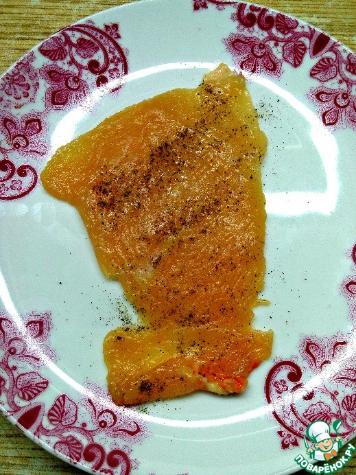 Пока займемся мясом. У меня была грудка с кожей и костью. Я отделила филе (вес указан чистого филе). Получилось 6 небольших кусочков. Отбиваем куски филе аккуратно через пленку.
