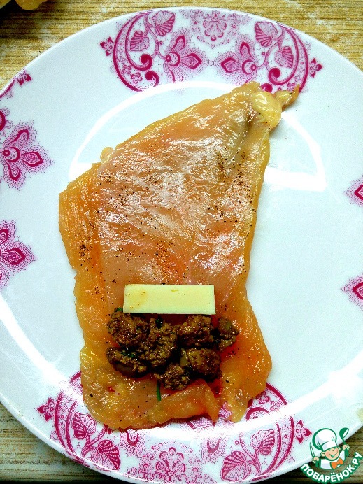 30 грамм сыра нарезать небольшими брусками по количеству филе. На край отбитого филе выкладываем ложку печени и брусок сыра.