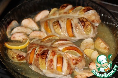 9. В огнеупорную форму выложить куриные грудки, оставшиеся дольки лимона и яблок, влить яблочный сок и поставить запекаться в разогретую до 180 С духовку на 25 минут.