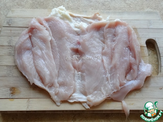 Куриную грудку отделить от костей, надрезать по краям, делая пласт из нее тоньше; Посолить;