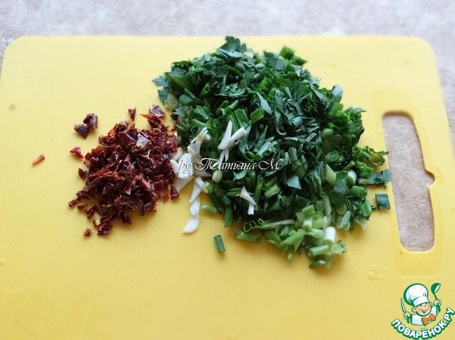 Зелень и чеснок порубить, добавить паприку, размешать, слегка растирая зелень пальцами для стимуляции выхода сока;