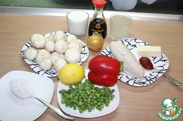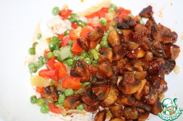 В миске соединить обжаренные овощи и курицу. Далее жарим шампиньоны, добавив сливочное масло. Готовим на тихом огне 5 минут, затем добавляем соевый соус и томатную пасту. Готовим ещё 5 минут. Далее выкладываем грибы к курице с овощами.