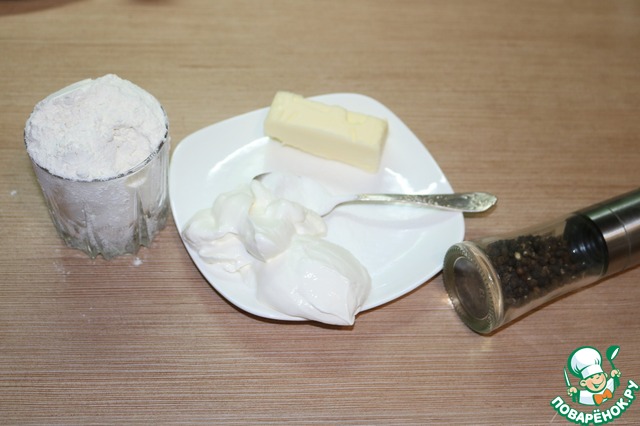 Смешайте в миске муку, пекарский порошок, соль, чёрный и кайенский перец. Добавьте нарезанное масло и перетрите с мукой. Добавьте сметану.