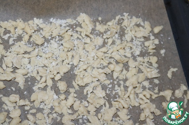 Застелите противень пекарской бумагой. Выкладываем на противень маленькие комочки теста. Выпекаем 10-13 минут. Остудите. Духовку не выключаем.