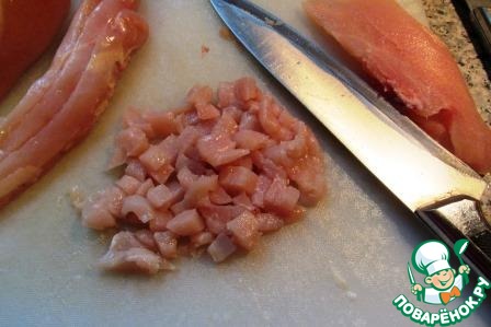 Куриное филе нарезаем мелким кубиком. Очень удобно нарезать чуть подмороженное филе.