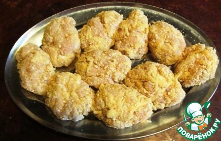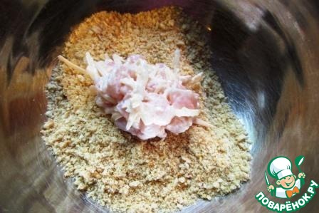 Насыпаем в миску панировочные сухари. Столовой ложкой выкладываем фарш и аккуратно обваливаем, придавая форму круглой котлетки.