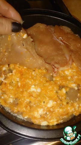 Сверху кладем еще отбивную (у меня получился первый слой из 1,5 куриного филе и второй слой из такого же количества). Выкладываем оставшуюся морковь.