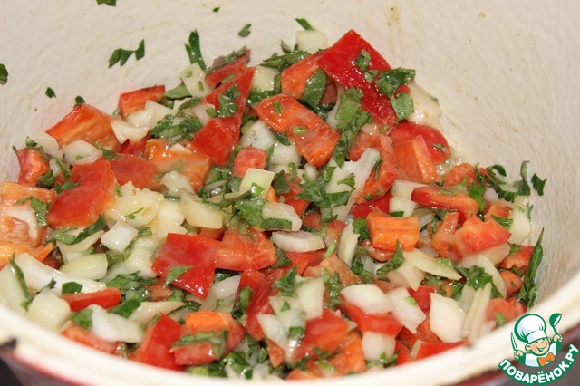 Как только подливка будет готова, сразу же положить в неё, лук, петрушку и перец и, не снимая с огня, перемешивать в течение 5 минут.