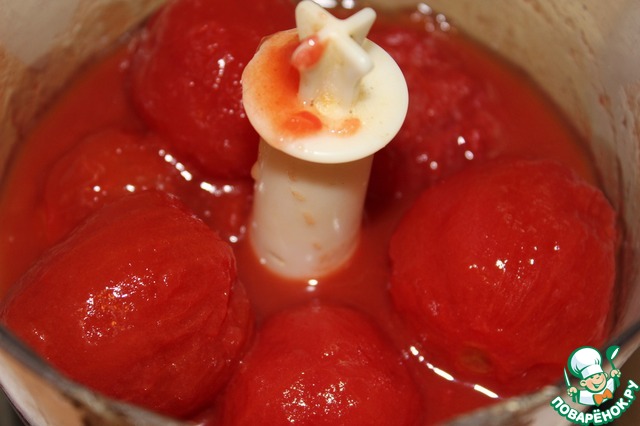 С помидоров снять кожицу и вместе с соком их в блендере.
