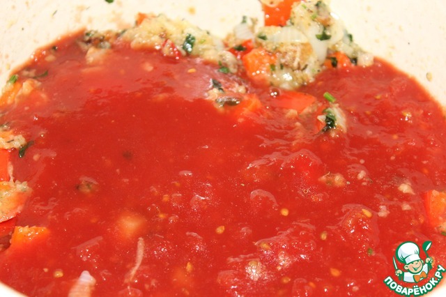 Кастрюлю снять с огня и добавить, перемешивая, томаты вместе с соком.