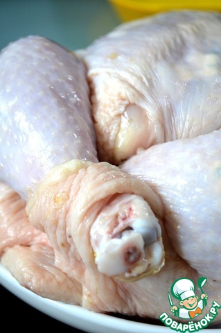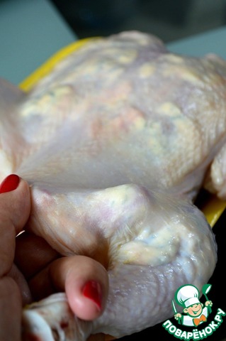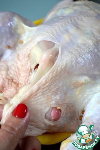 Куриную кожу аккуратно поднимаем пальчиками и отделяем от мяса, распределяем чесночное масло по поверхности куриного мяска - по грудке, ножкам, спинке, эту идею я подсмотрела у Наташеньки http://www.povarenok .ru/recipes/show/870 94/, спасибо!