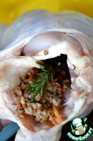 Фаршируем тушку гречкой, не забудьте положить веточку розмарина, аромат он даст прекрасный!