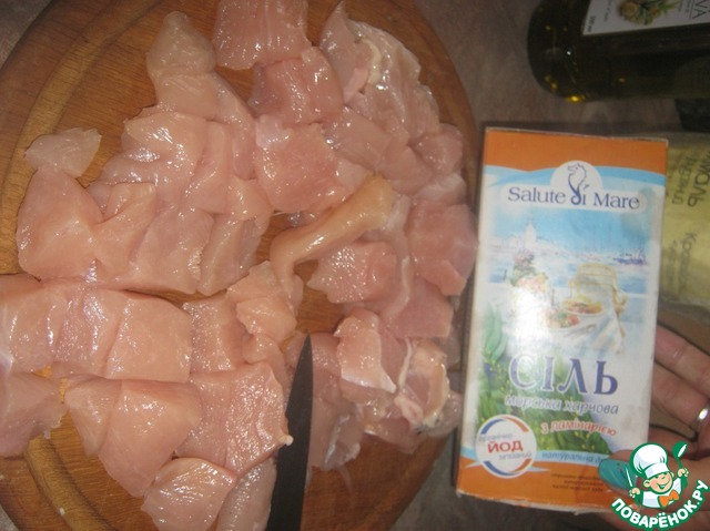 Филе нарезать кусочками, присолить. Я использую морскую соль с ламинарией.