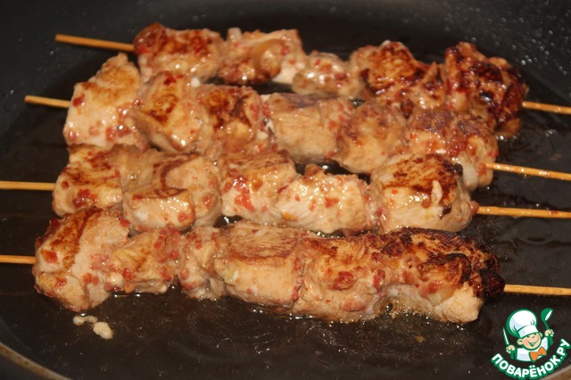 Разогреваем растительное масло на сковороде. Жарим наши шпажки с обеих сторон до румяной корочки и готовности.