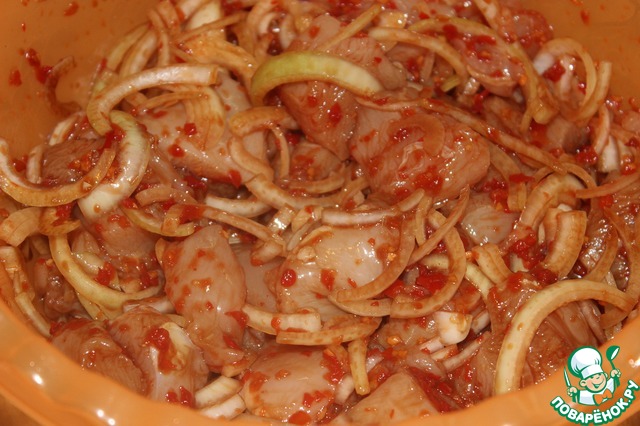 Куриное филе пересыпать луком и залить маринадом. Всё хорошо перемешать. Убрать на ночь в холодильник. Можно и меньше мариновать. Но так курочка будет мягче и ароматнее.