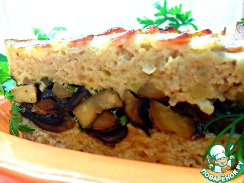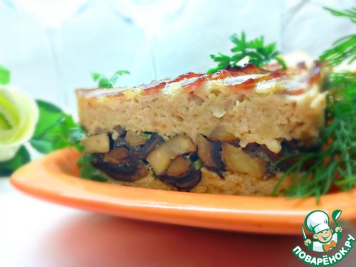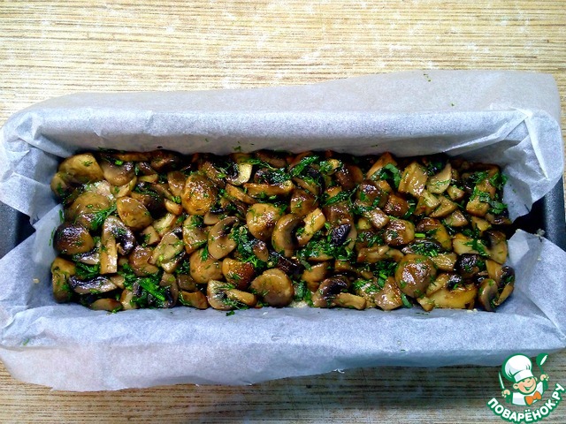 Сверху выкладываем шампиньоны с зеленью. Слегка прижимаем ложкой и сверху чуть присаливаем.