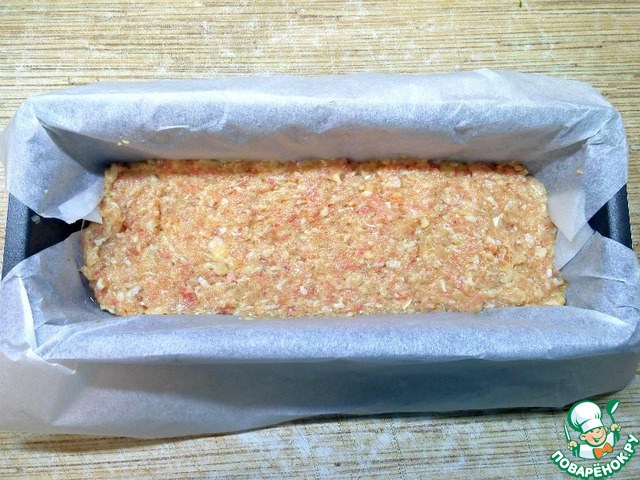 Форму для запекания для удобства застилаем пергаментом, смазываем 1 ч. л. растительного масла. Выкладываем половину фарша, разравниваем ложкой.