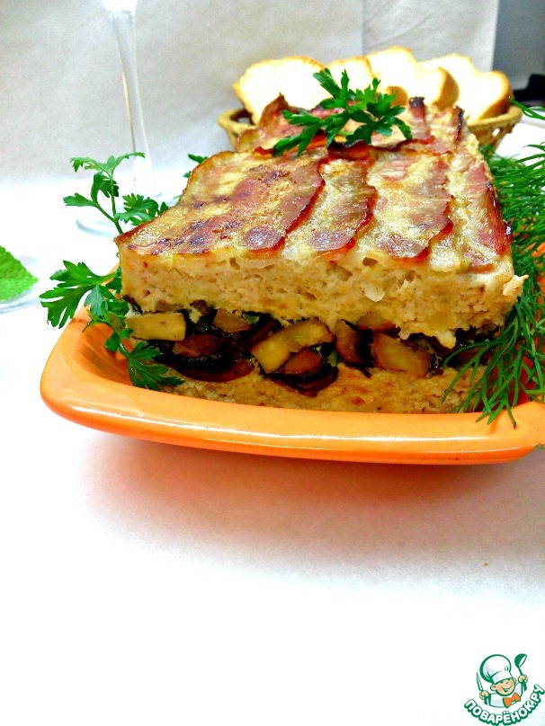 На грибы выкладываем вторую половину фарша, разровняем. Сверху внахлест укладываем полоски бекона.