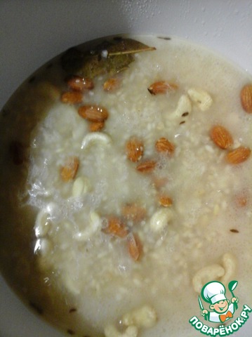 Залить водой на палец над уровнем риса, варить на медленном огне под крышкой 5 минут. Добавить орехи.