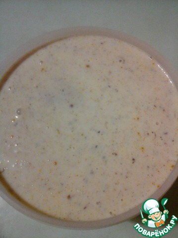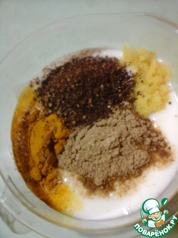 В кефир добавить зиру с кориандром, кардамон, карри и имбирь. Хорошо перемешать.