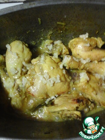 Добавить курицу, протушить под крышкой, через 5 минут добавить куркуму, снова накрыть крышкой и тушить еще 20-30 минут.