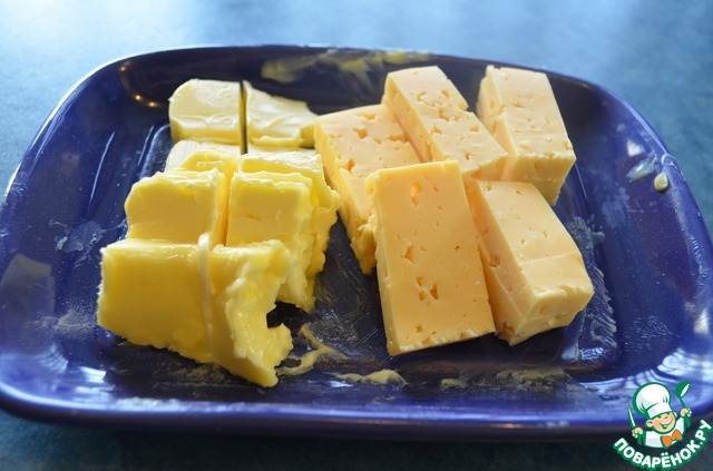Нарезать небольшими брусочками сыр и масло сливочное.
