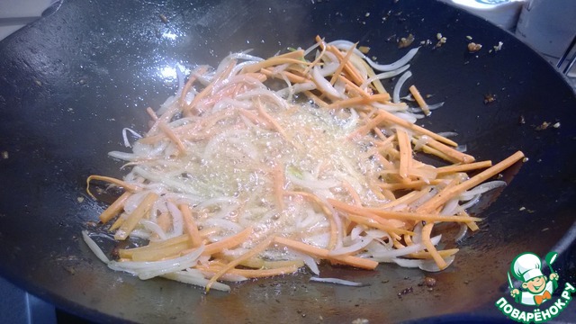 Убираем кабачки из вок и отправляем в него лук с морковкой. Обжариваем постоянно помешивая.
