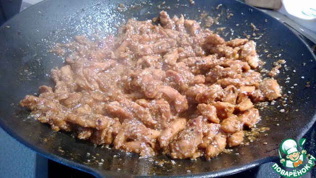 Уже почти все готово! Осталось снова добавить в вок курицу. Добавляем в нее кунжут и еще немного обжариваем.