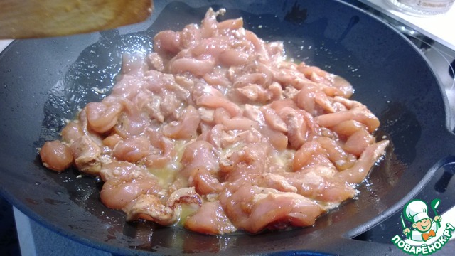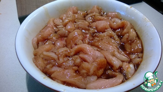 Куриное филе нарезаем ломтиками.