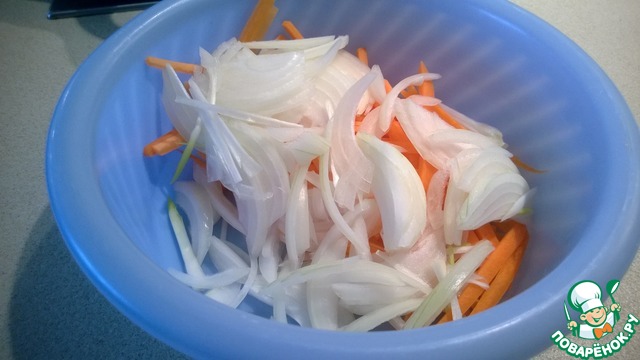Лук нарезаем полукольцами, морковку полосками.