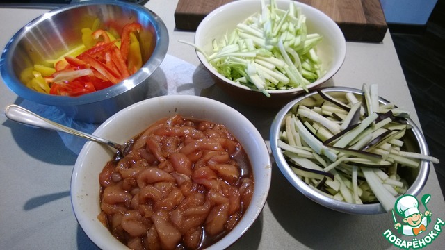 Не забываем нарезать перцы тоже полосками. Итак, заготовка сделана! Можно приступать к приготовлению.