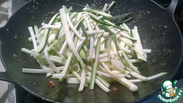 Настало время овощей. Удаляем курицу из вока. Добавляем в него кабачки.
