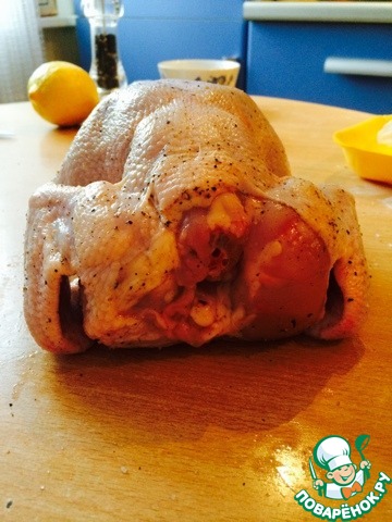 Тушку курицы вымыть, обсушить бумажным полотенцем. Натереть солью и перцем внутри и снаружи.